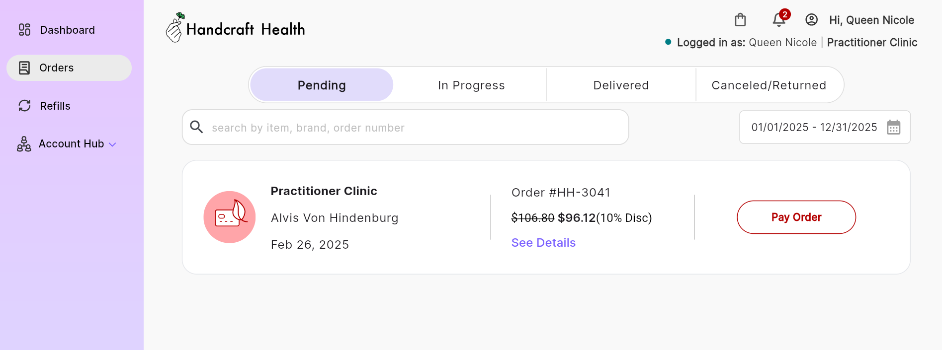 Once your payment is complete, we will begin preparing your package for delivery. You can track your order status directly from your dashboard. If you have any questions or issues, support is available to assist you at support@handcraft.health