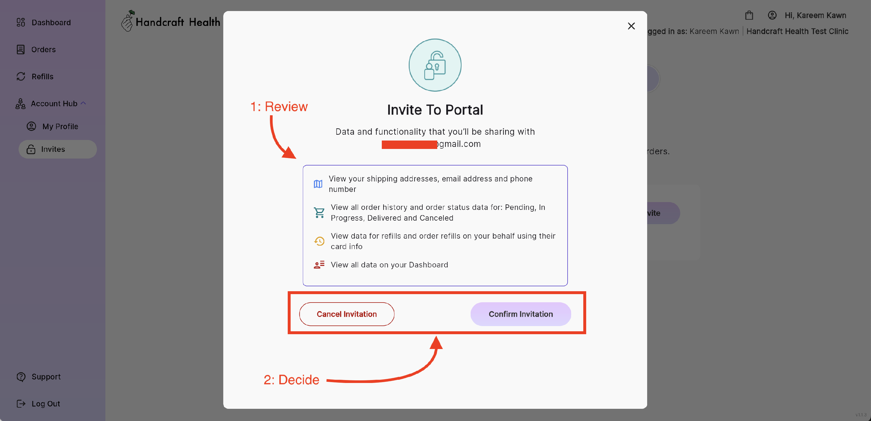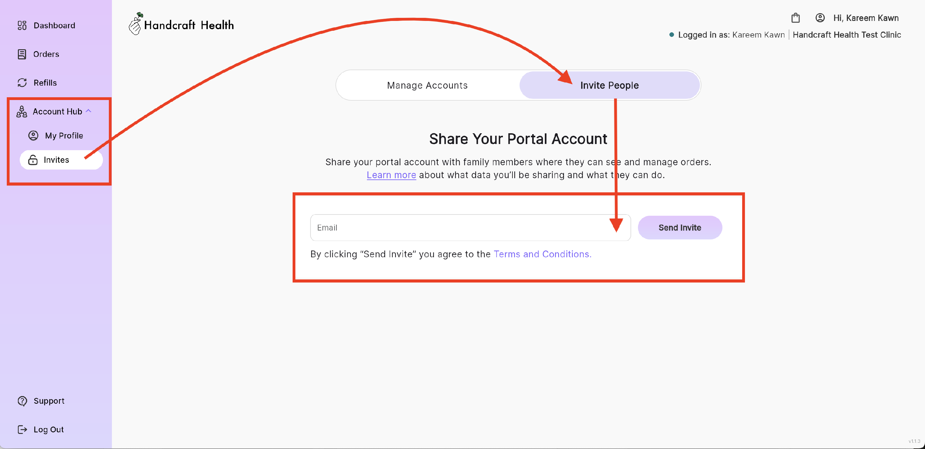 Send an invites to family members, friends, or partners that you wish to share your Handcraft Health account with. They will be able to see your personal and contact info, order history, delivery and order statuses. They can also reorder products using their personal card (not yours),